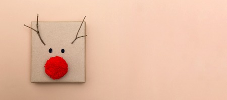 Red nose reindeer gift box on a light brown background