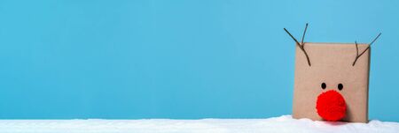 Pompom reindeer gift box in a snow covered landscape