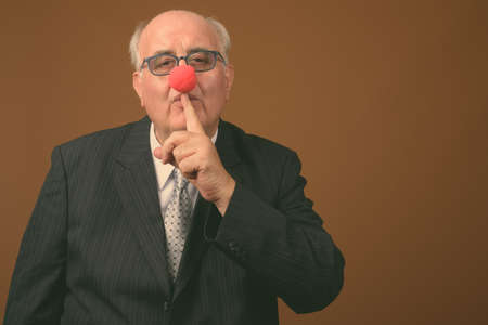 Overweight senior businessman wearing clowns nose against brown background