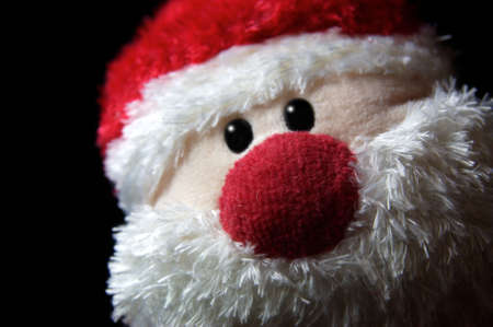 Holidays wallpaper background of Santa Claus toy with silver bell on his hand isolated on black background.