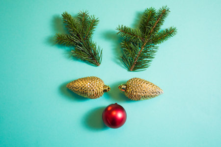 Reindeer face made of Christmas decoration and wooden horns. Minimal christmas concept. Flat lay.