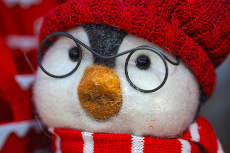 Soft toy. White penguin in a red hat with a scarf. New year gift.