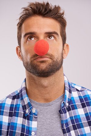 Clowning around. Studio shot of a handsome man wearing a red nose against a gray background.
