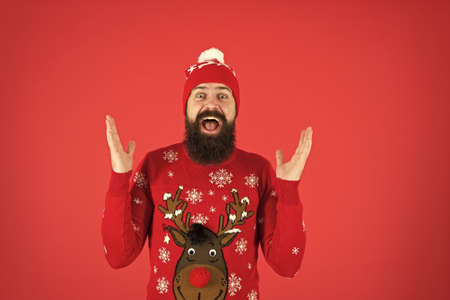 Happy new year concept. Join winter holiday party. Christmas Sweater Party. Winter outfit. Fun activities and things to do. Hipster emotional bearded man wear winter sweater and hat red background
