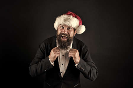 Tie your look together with xmas style. Bearded man fix bow tie. Happy santa wear elegant formal style. Christmas style and fashion trend. Holiday party style. Festive and chic, vintage filter