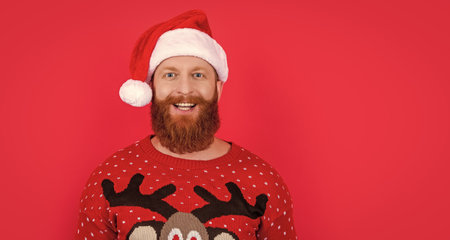 happy new year man in santa hat. new year holiday. bearded santa man at new year, copy space