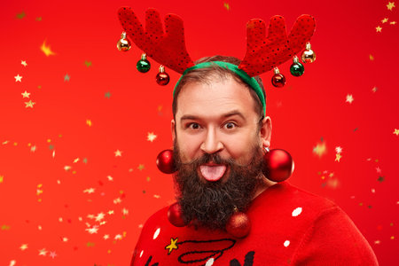 Portrait of a funny hipster man with a beard decorated with Christmas balls making funny faces at camera. Red background with confetti.