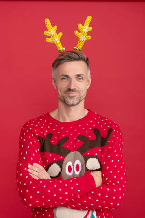 smiling man in winter sweater and party antlers. xmas guy on red background. happy new year.