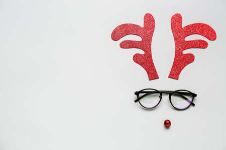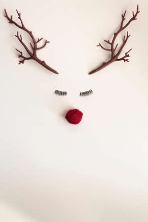Christmas reindeer concept with red nose and antlers and eyelashes on white background with copy space