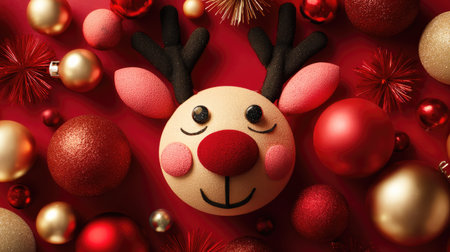 A charming reindeer decoration is surrounded by vibrant ornaments and baubles, creating a festive and joyful atmosphere ideal for holiday celebrations.