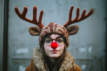 Young woman dressed as a funny reindeer, celebrating Christmas or winter holidays. Festive and unique character