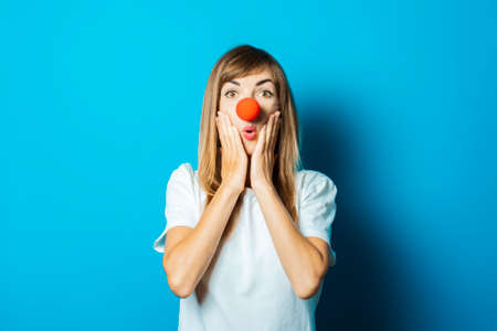 Beautiful young woman in a white T-shirt and red nose of a clown with a surprised face on a blue background. Concept party, costume, red nose day.