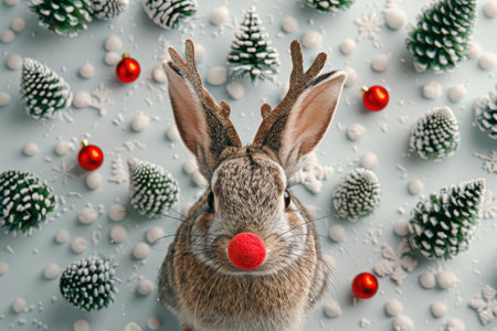 A rabbit with antlers on its head is standing in front of a snowy background. The scene is festive and playful, with the rabbit's antlers and red nose adding a touch of whimsy to the image with Generative AI