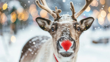 A reindeer with a red nose and antlers is standing in the snow. The image has a festive and joyful mood, as it is likely taken during the holiday season