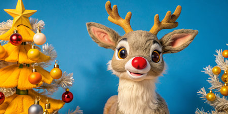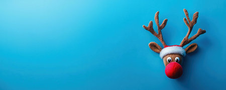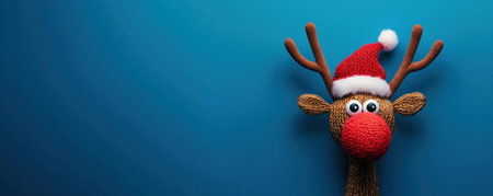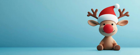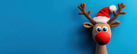 Cute plush reindeer wearing a Santa hat and red nose, set against a bright blue background. Perfect for holiday and festive themes.