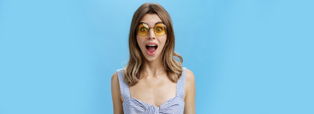 Waist-up shot of excited surprised and emotive charismatic caucasian woman in trendy sunglasses opening mouth from amazement and joy gazing at camera impressed and astonished over blue background