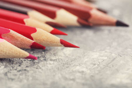 different pencils on wooden rustic table, red on first plan