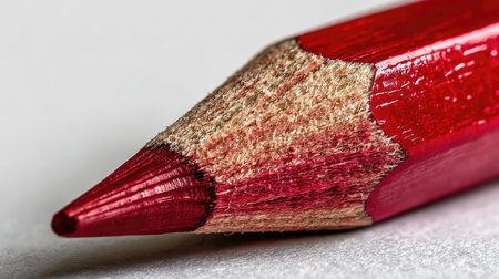 This macro shot captures a sharpened red colored pencil resting on a light surface, emphasizing its texture and vibrant color suitable for creative projects.