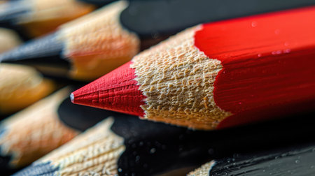 Close-up of a red pencil in contrast with multiple black pencils, illustrating initiative, independence, and creative thinking in business success