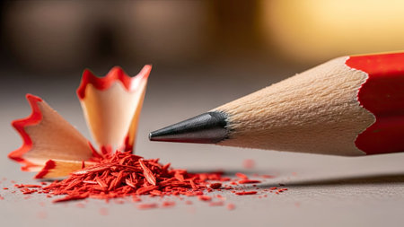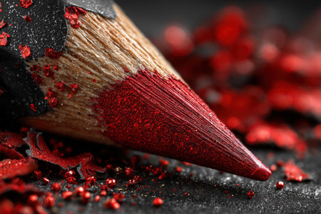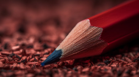 This close-up image showcases a sharpened red pencil with vibrant shavings scattered around it. The texture and color contrast create an engaging visual for art and creativity themes. ai generated.