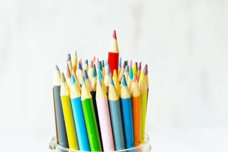 Pack of color pencils with a single sharp one symbolizing leadership concept