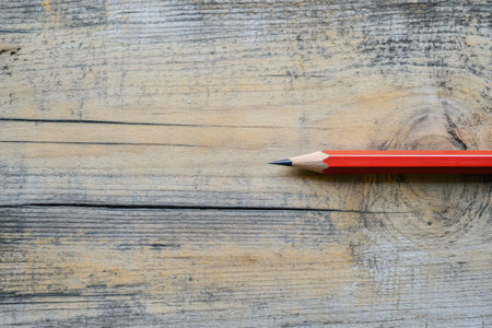Red pencil rests on wooden surface