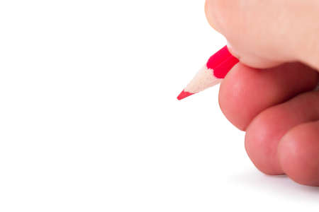 Hand holding red pencil for writing with copyspace, isolated on white background.