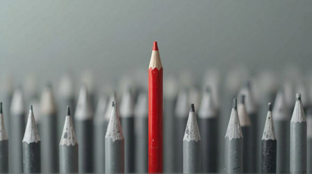 One red pencil stands out amongst a group of gray pencils, symbolizing individuality and leadership.