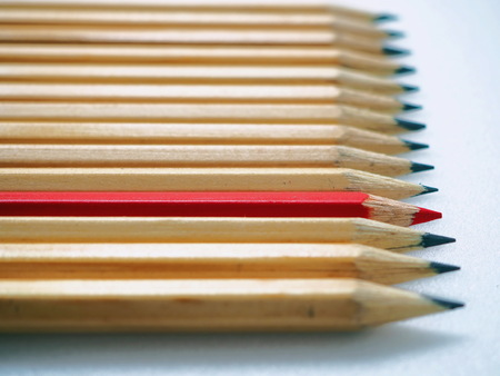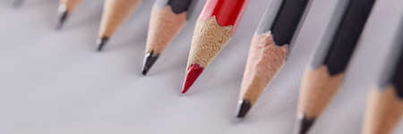 Red sharp wooden pencil standing above others closeup