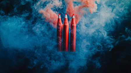 Close-up of three red crayons surrounded by colorful smoke, creating a dramatic and artistic effect on a dark background.