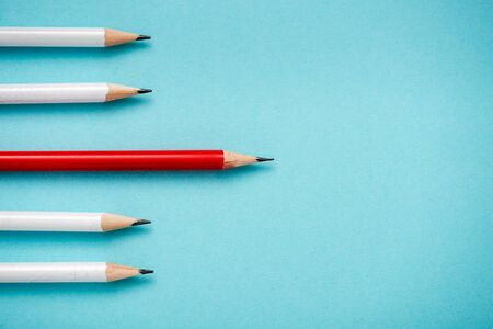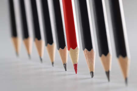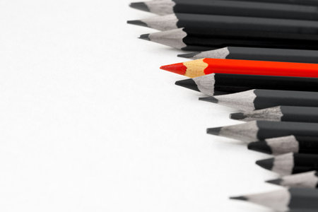 Red pencil standing out from crowd of plenty identical black fellows on white table. Leadership, uniqueness, independence, initiative, strategy, dissent, think different, business success concept.