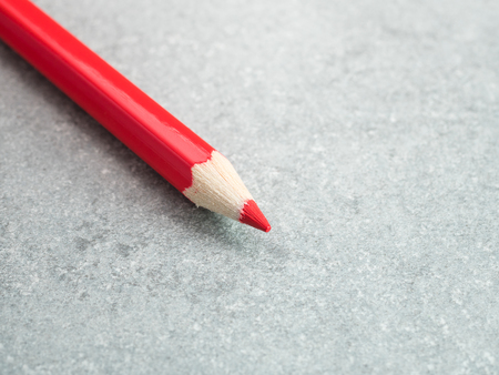 Closeup red color pencil on bare cement or concrete wall background (Selective Focus)