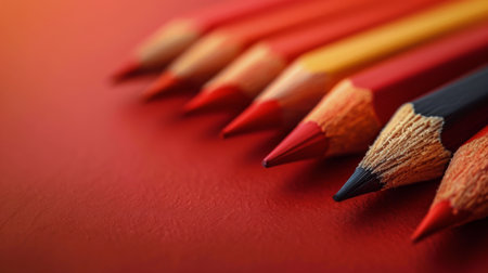 A straight row of vibrant colored pencils is neatly lined up against a solid red wall. Each pencil stands upright, showcasing its various colors and sharpened tips.