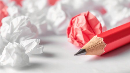 A red pencil lies among scattered crumpled paper balls on a white surface, suggesting brainstorming or creative block.