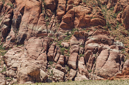 Steep, rugged red-rock escarpment of Red Rock Canyon rising in Nevada, USA, with scenic loop drive road.