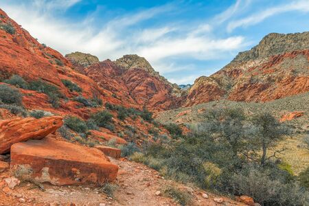 View of rock formations and flora in Red Rock Canyon National Recreation Area, Las Vegas, Nevada, USA, North America