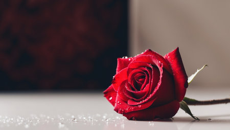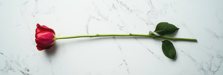 A solitary red rose rests gracefully on a pristine white marble surface, highlighting minimalistic beauty and simplicity.