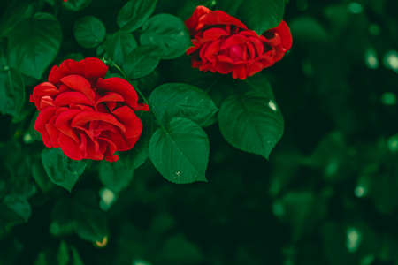 Deep red blooming rose bud on a dark green background. Roses in a botanical garden. Beautiful flower Summer floral wallpaper.