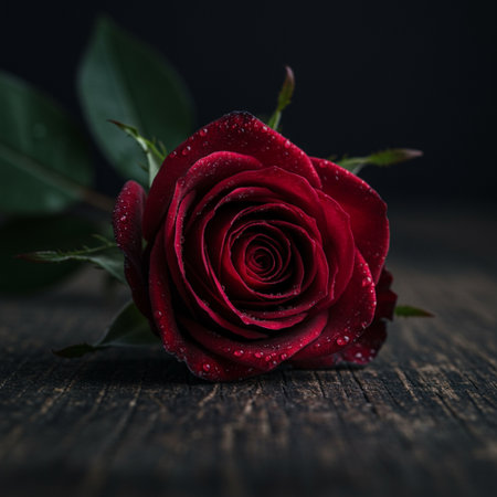 A stunning red rose with crisp droplets of water rests against a soft-focus dark background, highlighting its delicate beauty and vibrant color for floral enthusiasts.