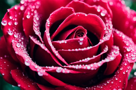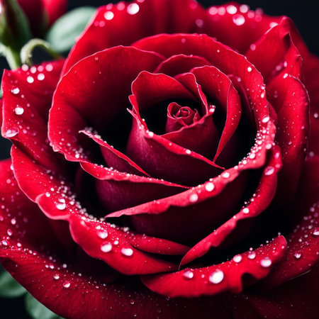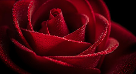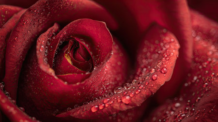 This close-up showcases a deep red rose, its velvety petals glistening with water droplets. The composition emphasizes the flower's intricate details, revealing texture and form. The lighting creates highlights and shadows, enhancing the visual appeal of this floral study. Suitable for various editorial and commercial applications.