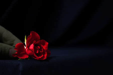 a hand lays a dark red rose on a Gothic-style table covered with a black tablecloth. high quality photo