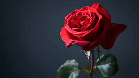 Single red rose with soft petals and green leaves against a dark background. Elegant floral portrait with moody lighting, conveying romance and beauty.