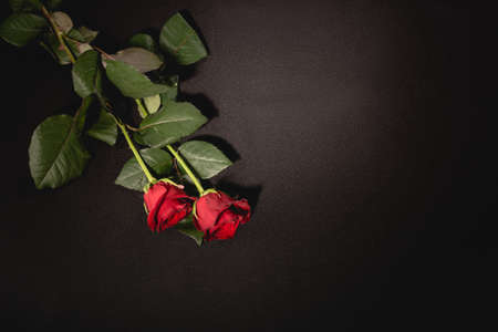 two red roses on black background, funeral concept