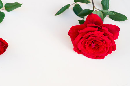 Blooming red roses on a white background. Top view.Creative flat lay, copy space.