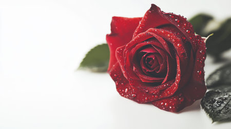 A single red rose with dewdrops on its petals, positioned elegantly on a white background, emphasizing its beauty and freshness