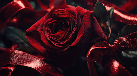 A captivating closeup of a red rose adorned with shimmering red ribbon, ideal for themes of love and romance, showcasing natural beauty and elegance.