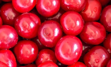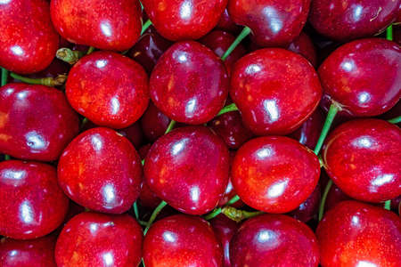 Fresh ripe cherries in colander, close up, view from above