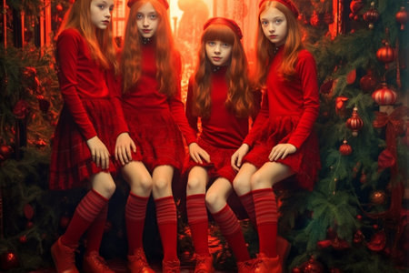 Three young sisters in red and white winter clothes posing up the white fence against Christmas house Holiday concept : Generative AI