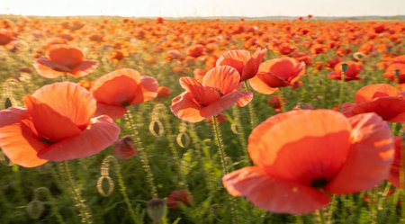 Lush backdrop of vibrant red poppies with delicate petals and dark centers