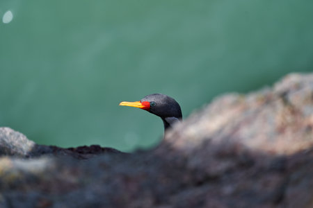 Phalacrocorax gaimardi is a red legged cormorant with hypnotic blue sprinkled eyes, sitting in the rock wall of cliffs cloase to Puerto deseado at the atlantic coast of Patagonia in Argentina_13
